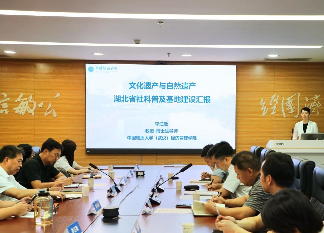 6月27日上午,省社科联党组成员、秘书长许巍一行莅临成人网站 文化遗产与自然遗产湖北省社科普及基地开展走访调研。省社科联科普部主任徐维洲、学院党委书记杨昌锐、校科发院副院长兼成人网站 副院长郭锐、校科发院人文社科办公室主任姜珊,学院李记亮副书记、郭海湘教授、团委书记努尔夏提·居勒提、基地负责人李江敏教授以及基地代表刘晶晶、肖拥军、柴海燕参加调研座谈。