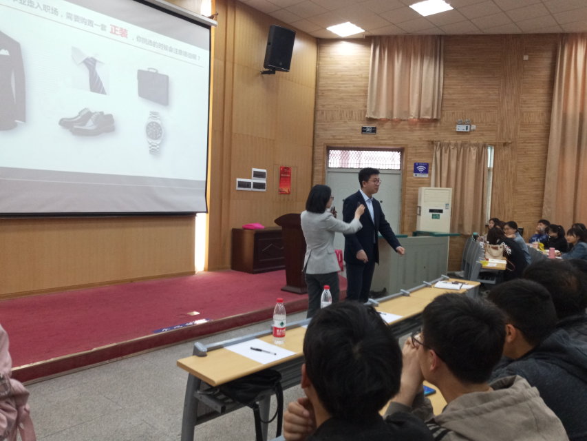 曾老师对礼仪进行了简短的概述,从着装礼仪、面容礼仪、举止礼仪、电话礼仪、介绍安排、握手礼仪、递接礼仪、会议礼仪、乘车礼仪等方面对职场所涉及的礼仪进行了全方位指导。讲到着装礼仪时,曾老师特意邀请辅导员田昆老师进行了西装展示,给同学们更加直接的视觉体验。举止礼仪方面,老师带着全场学生体验了标准的站姿、坐姿,让学生更为直观的了解到举止礼仪的重要性。
