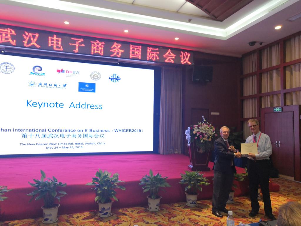 (通讯员:朱镇)2019年5月24日至5月26日,由我校成人网站 、电子商务国际合作中心,美国阿尔弗雷德大学商学院和德国巴登-符腾堡州联合大学共同主办,武汉纺织大学管理学院参与承办的第十八届武汉电子商务国际会议在纽宾凯新时代国际酒店召开。会议主席赵晶教授主持了开幕式,校党委副书记成金华教授,国际信息系统协会前主席Doug Vogel(前AIS主席),以及信息系统学会中国分会副主席、中国人民大学王刊良教授现场致欢迎词。来自国内外高校的190多名专家学者参加了会议,其中来自美国、澳大利亚、德国、加拿大和芬兰等8个国家和地区,15所大学的21位国外专家出席会议。