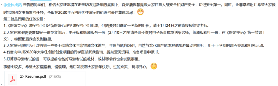 自学院发布2020春季教学方案部署,广大师生积极响应“停课不停教、停课不停学”的号召,沉着应对疫情,各项教学工作在2020.2.10如期顺利展开。为确保教学工作顺利进行,任课老师积极部署,提前制定教学计划,按照课程进度有条不紊进行教学,稳步进行疫情期间远程教学工作。结合《旅游英语》教学安排,在假期提前布置适当的寒假作业,以期同学们充实愉快地迎接新学期。从开学前的反馈情况来看,对学生的督促作用比较明显。
