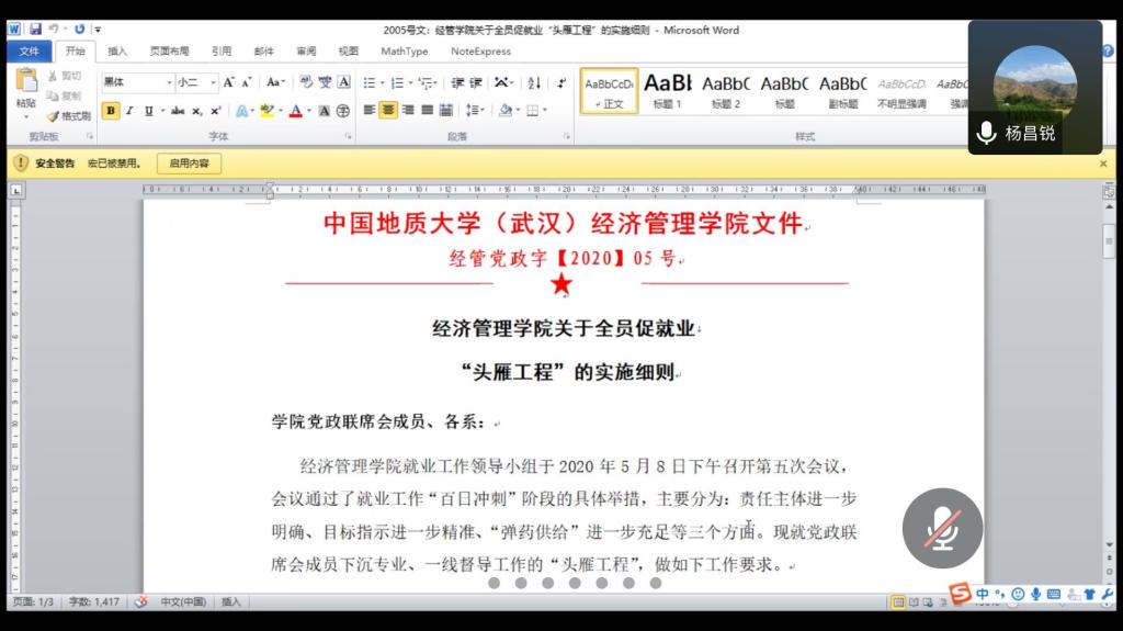 会议伊始,杨昌锐书记对经济系毕业就业双促工作进行动员。杨书记首先对经济系在特殊时期召开毕业就业双促会做出了高度肯定,指出经济系党支部在疫情期间各项工作中发挥了先锋带头作用,彰显了战斗堡垒功能,并明确表示对经济系2020届毕业生就业工作充满了信心。其次,杨书记从全面重视、全员参与、全方位就业、全过程跟踪等四个方面,对学院双促工作安排进行了详细阐述,强调就业关系学生前途命运,是学科发展根基,要放在战略高度全员重视。杨书记还指出:特殊时期,武汉作为疫情重地,防疫工作虽然目前取得了决定性的胜利,但仍然不能大意,减少不必要的外出,外出不要聚集,注意防护。