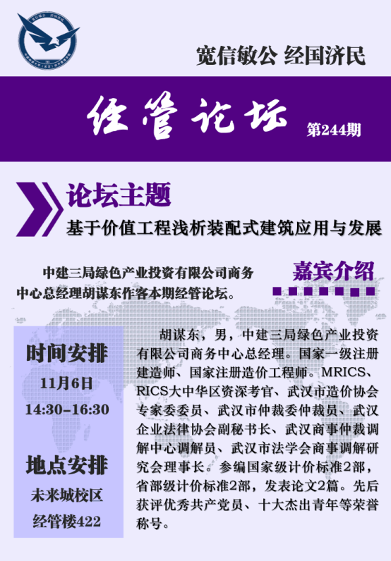 2020年11月6日下午,中建三局绿色产业投资有限公司商务中心胡谋东总经理做客经管论坛,在未来城校区成人网站 422作了《基于价值工程浅析装配式建筑应用与发展》的报告。王广民、孙涵、翁克瑞、柯小玲、何晨琛、卢辉、彭亚婷等老师及多位博、硕士研究生到场聆听胡谋东总经理的精彩报告。