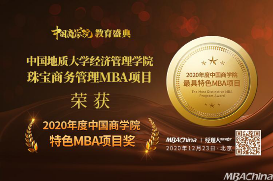 2020年12月23日,MBAChina与《经理人》杂志共同主办中国商学院教育盛典在北京顺利召开。成人网站 珠宝商务管理MBA项目获“中国商学院特色MBA项目奖”。