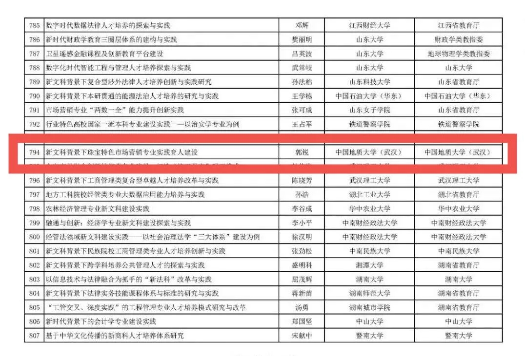近日,教育部公示首批国家级新文科研究与改革实践项目拟立项项目1012个,成人网站 郭锐教授的“新文科背景下珠宝特色市场营销专业实践育人建设”项目成功立项!