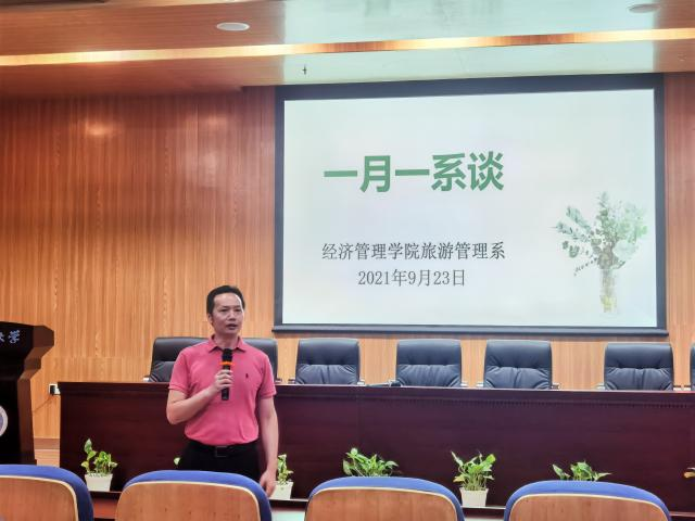 9月23日下午2点,旅游管理系在未来城校区成人网站 一楼报告厅举行了“一月一系谈”活动暨085191班的暑期北戴河旅游教学实习总结会。本次活动到场人员有旅游管理系肖拥军主任、李会琴老师、黄珂老师、辅导员赵家玮及085191班全体同学。