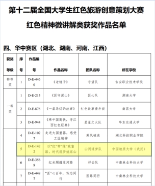 2022年6月30日,在中国共产党成立101年纪念日前夕,第十二届全国大学生红色旅游创意策划大赛初赛结果公布,成人网站 李会琴老师指导的“山河逐梦队”(学生成员:刘婉婷、赵芳琪、龙心滢、吴胜珍、加里)荣获“红色精神微讲解”类华中赛区一等奖。这是成人网站 连续两年在该项大赛中获奖,作品质量和奖项等级都实现了新的突破。