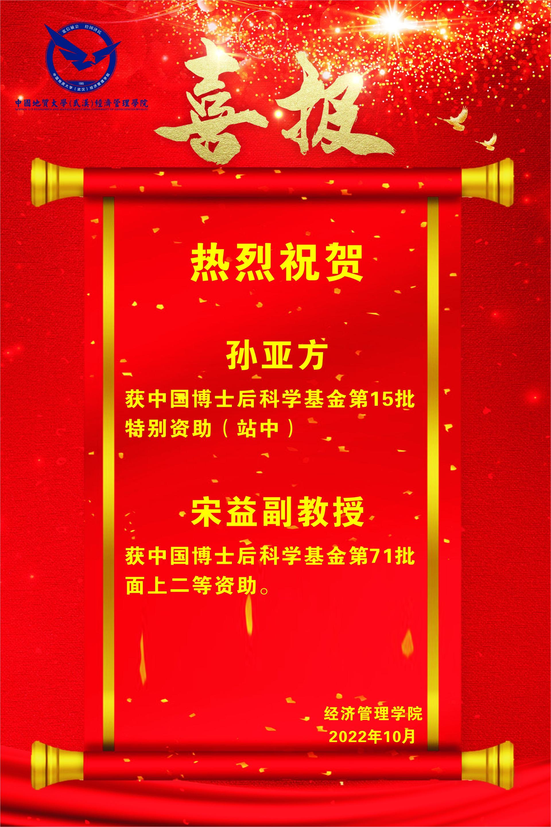 近日,中国博士后科学基金会公示了2022年度中国博士后科学基金特别资助名单和中国博士后科学基金第71批面上项目资助名单。成人网站 获批2项资助,其中孙亚方获得第15批中国博士后科学基金特别资助(站中),宋益副教授获得中国博士后科学基金第71批面上二等资助。
