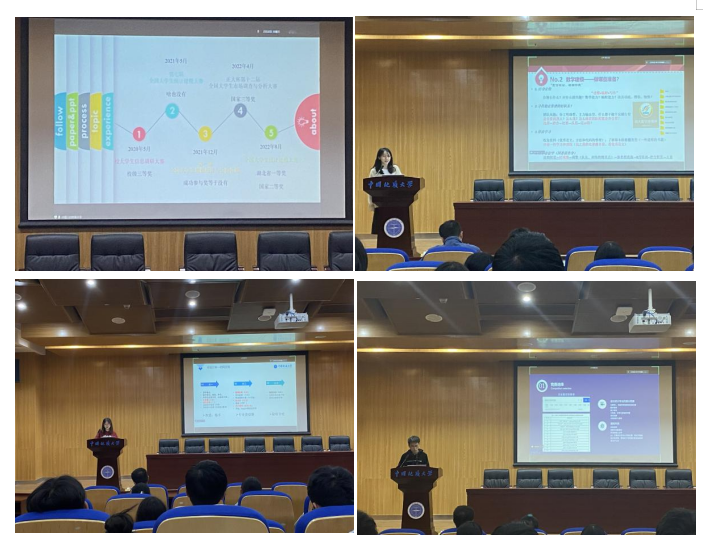 首先,2019级刘瑾沂同学、2020级任逸霏同学和蔡丽云同学以及2021级苏海滨同学做了参赛经验分享。刘瑾沂同学在线上讲述了从大一到大四参赛的心理历程变化,并梳理参赛过程。她强调不要自我精神内耗,鼓励同学们在学有余力的同时通过参赛来检验和提升专业能力;蔡丽云同学结合自身经验,着重介绍了各种数学竞赛的主办单位、竞赛时间、报名费用、获奖设置等,建议参赛前要自身定位:“你擅长什么?对什么感兴趣?数学能力?编程能力?”,同时收集一些优秀论文和之前的比赛题目,了解基本的赛题类型和方法。参加国赛,前期积累也非常重要,可以以小赛促学,不断调整训练的侧重点。她分享了相关参考书籍和网上课程,同时提醒同学们要寻找靠谱的团队,大胆迈出第一步;苏海滨同学分享了竞赛信息来源,对竞赛团队中责任分工和保持良好心态做了分享,建议多和指导老师沟通,了解自己在比赛时还存在的不足与欠缺,及时改进。同时提醒同学们要注重平时课程作业的质量,它不仅可以了解各种报告和论文的格式,还可以有效锻炼自己的文本表达能力;任逸霏同学对参赛收获做了分享,认为参赛不仅可以提高专业知识技能,还可以在写作能力、信息检索能力、扩宽视野、社交能力等方面得到锻炼,提升自己的综合素质。并对英文类型的竞赛以及前期竞赛准备做了重点分享。四位优秀同学分享参赛经验后,王林珠老师对学校和学院认可的重点竞赛进行了补充介绍。