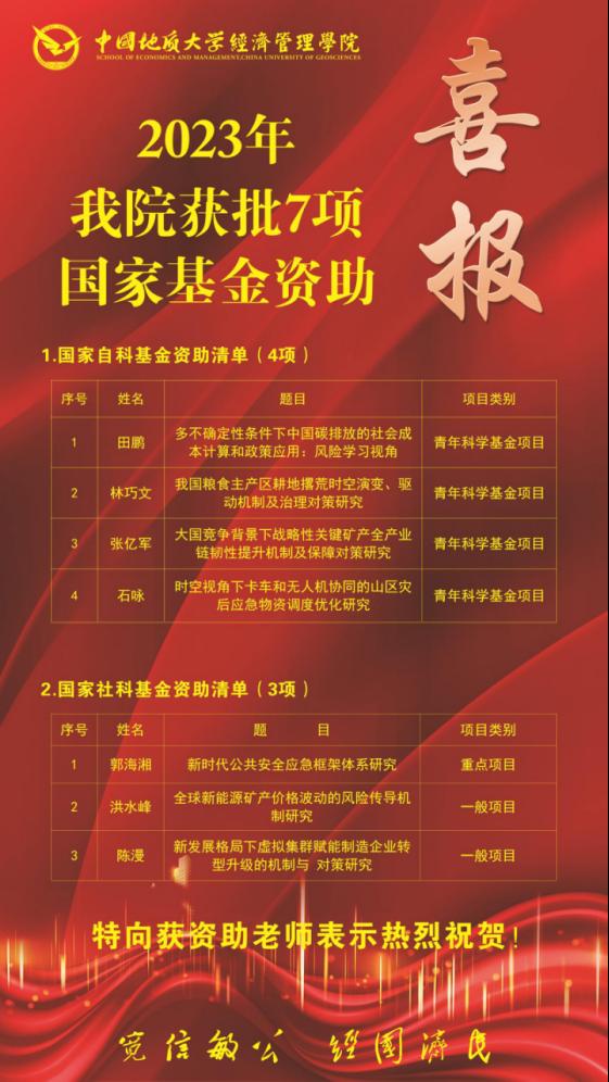 (通讯员 胡松琴)2023年8月份以来,随着国家自科基金各类项目立项结果陆续公示、国家社科基金年度项目和青年项目立项名单陆续公示,成人网站 共有7个项目获得资助,其中国家自科基金获批青年科学基金项目4项,国家社科基金获批重点项目1项、一般项目2项。具体名单如下: