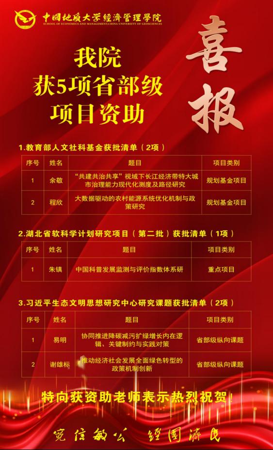 (通讯员 胡松琴)近日,随着2023年度教育部人文社会科学研究一般项目评审结果的公示、2023年湖北省软科学计划研究项目(第二批)拟立项项目向社会公示、习近平生态文明思想研究中心2023年度研究课题的公示推出,成人网站 获批省部级项目共5项。其中教育部人文社科2项,省软科学计划研究项目(第二批)重点项目1项,习近平生态文明思想研究中心研究课题2项。具体名单如下:
