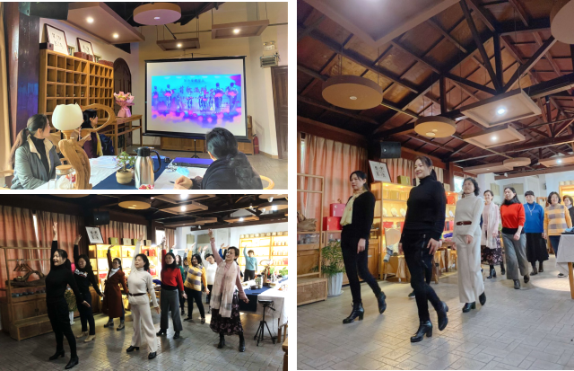 分享会上,爱好文艺活动的分工会主席王萍老师则向大家展示了学院参与校模特队的“女神”们编排的系列气质旗袍秀表演活动,还特意请来校模特队的队长钱军老师给大家普及形体美知识和日常训练方式,让各位女老师学到了在日常行走和工间休息时可随时插空开展塑形塑美、让美自内而外散发的“小秘籍”。