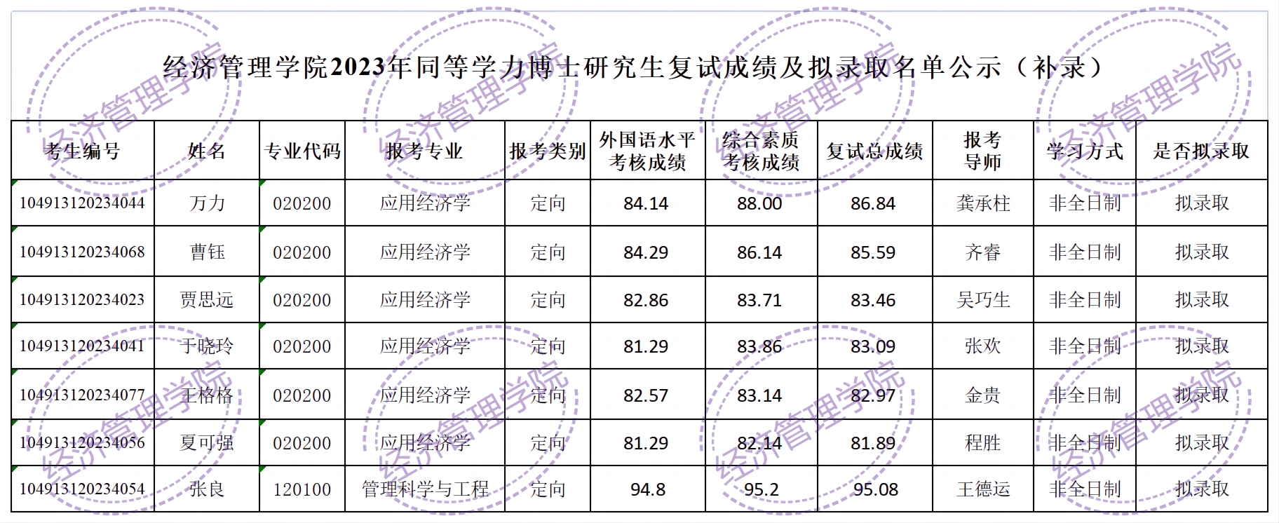 经批准,现对学院2023年拟录取单证博士生补录名单予以公示,公示期为6月16日-6月25日。在公示期内有异议的,请联系成人网站 研究生办公室王老师,联系方式:027-67883204,邮箱:[email protected]。