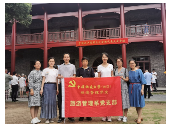 旅游管理系支部党员和群众教师一行首先来到位于武昌区红巷13号的中央农民运动讲习所旧址。在旧址大院内,支部成员先行庄严重温入党誓词,然后在支部书记李江敏的带领下,先参观了依据历史资料复原的办公室、教室、大操场、宿舍、膳堂等办公、学习和生活场所,再至历史博物馆内深入学习了解农民运动讲习所的历史及其对中国革命的影响。期间,李江敏同志和鄢志武同志为大家的学习参观进行讲解。