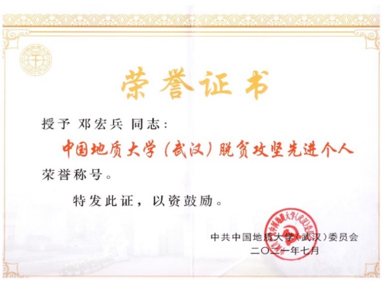 图3邓宏兵教授被授予“成人网站 (武汉)脱贫攻坚先进个人”荣誉证书