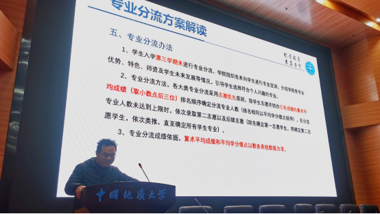 会议开始,教务科石磊老师对学校、学院的专业分流实施方案进行了解读。本科生按大类招生的政策体现了以学生的全面发展为最终目标,以培养宽口径、厚基础、高素质、强能力,具有创新精神的复合型高级经济和管理人才为具体目标的宗旨。按照“打通”培养和“分段”培养相结合的方式,学生进校后前1.5年,以通识教育课和大类基础课学习为主,学院针对“三个大类”和“一个专业”开设统一的大类基础课(学科平台课程),以为学生更好地学习专业课程和未来的发展奠定宽广而坚实的基础。成人网站 工商管理大类按照分流要求,计划分为工商管理(双语班)、市场营销、会计学和旅游管理四个细分专业,大类专业分流采用公开、公平、公正的以志愿与专业规模适度平衡相结合、学生志愿与学习成绩相结合的原则,按学生志愿并结合已有成绩的算术平均成绩排名顺序确定分流专业人数,在分流专业人数未达到上限时,依次录取第二志愿以及后续志愿。