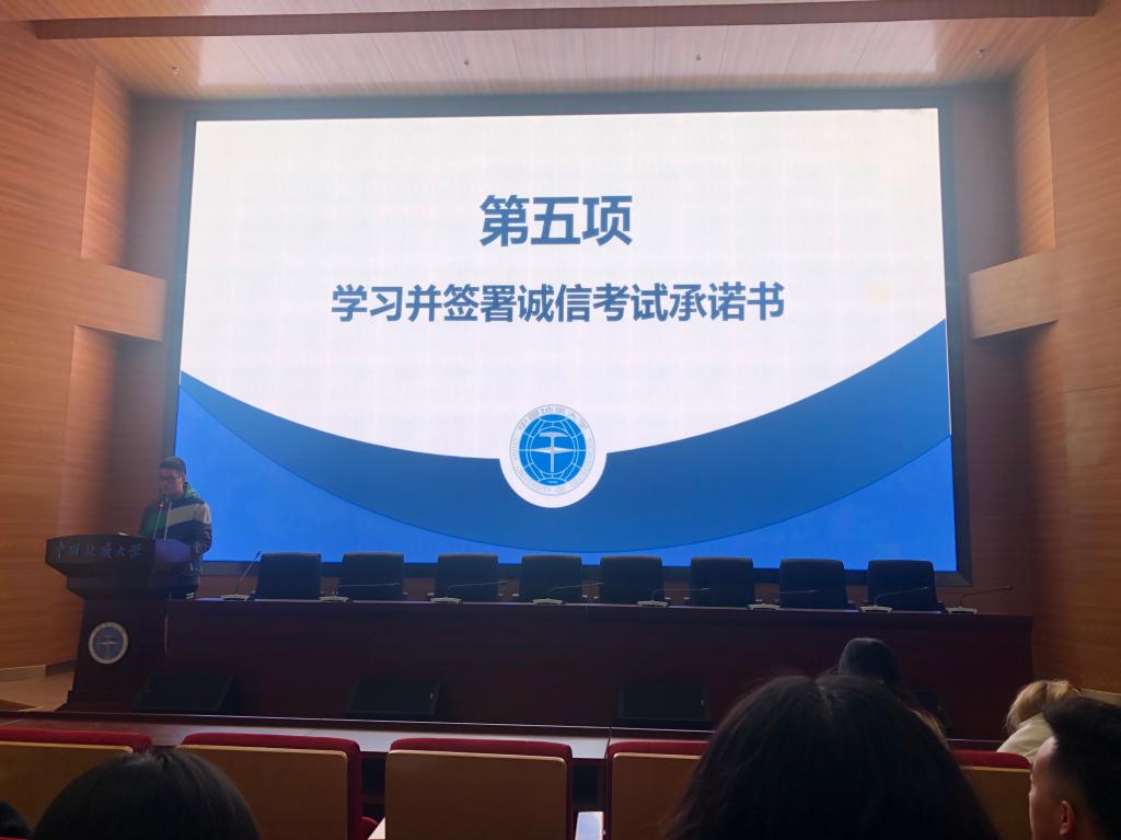 活动的第二项议题是考风考纪诚信教育。努尔老师首先带领同学们学习了《中华人民共和国刑法(修正案九)》中有关考试作弊的规定,呼吁同学们增强守法懂法意识。其次结合我校《成人网站 (武汉)本科课程考核违规处理办法》宣读了违纪行为的认定与处理等相关规定,要求同学们诚信参加任何考试。紧接着,082182班黄浩同学作为学生代表,带领同学们学习《诚信考试承诺书》内容,全体同学签字承诺自觉遵守考核纪律。