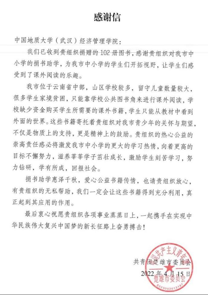在一年的支教生活中,张康同学始终不忘自己是一名地大经管人,生活中发扬“艰苦朴素,求真务实”的校训精神,牢记“宽信敏公,经国济民”的院训精神,做到把地大精神带到服务地,讲好地大故事。积极配合研支团完成把地大特色活动开展到龙江的任务;利用班会时间给学生们播放地大相关宣传视频,讲述个人求学的故事,播撒希望种子。在五四青年节前夕,他带着支教团同学联系母校,发起向云南省楚雄市山村中小学校捐赠书籍的公益活动。本次捐赠活动得到了母校多个学院的大力支持,共筹集到书籍600余册,其中成人网站 捐赠图书102册,涵盖文学、科普、经济、教育等多个领域。共青团楚雄市委员会对支教团及地大学生捐赠之举表示衷心的感谢,并向成人网站 发来感谢信。