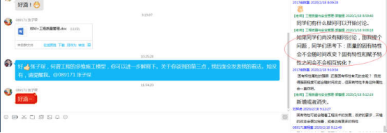 在线课堂互动是在线教学的难点,但在教师团队总结经验并自我改进后,形成了工程管理专业在线教育的一大亮点。为引导学生积极思考,工程管理系集思广益,共同商定多种互动方式。其一,以学生为主导,针对课程内容主动提问,老师在QQ 群中进行解答,解答的过程中也会引导其余同学继续思考相关问题。如在《工程质量与安全管理》的第一次课程中,有同学对“质量的固有特性”概念,对在上课过程中提到的案例有所疑问,老师于QQ 群中解答了该同学的疑问,同时询问学生对于案例的理解以引发讨论,课程结束后老师以文件形式再次发表自己的看法,鼓励学生进行讨论,以此加深同学们对于某些概念的理解。其二,以教师为主导,在无学生提问时采用引导的方式开始讨论。比如在《工程质量与安全管理》的第三次课程中,同学们一开始并没有提问题,老师就围绕之前谈到的质量固有特性的概念的相关知识,提问引起同学们的讨论。该方法能够继续加强同学们对于某个概念的理解,同时倡导同学们对于某个概念课堂上未讲到的知识,进行自主思考,抒发己见,提高同学们的自主学习能力。其三,教师点名讨论的方式开展课堂讨论。老师在PPT 视频里留一些当堂作业,涉及已学知识,在当次课程讨论环节,采用 QQ 点名回答的方式让同学们作答。以此作为变相点名,起到监督作用;同时也检查学生是否认真听课,并鼓励不喜远程交流的同学加入讨论,促进这部分同学提高学习积极性。