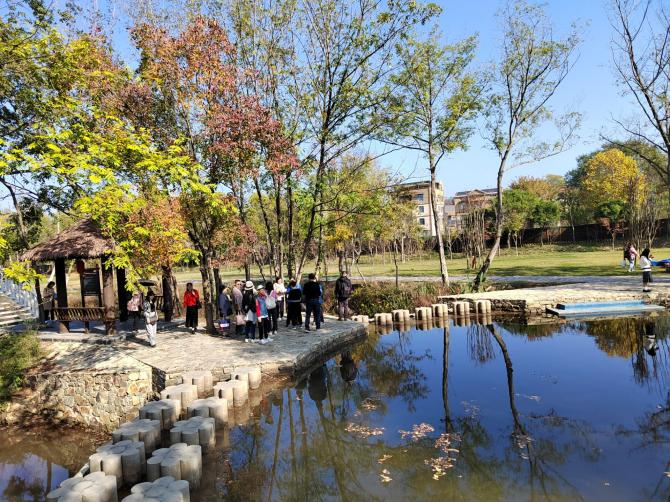 位于国家AAAAA级木兰文化生态旅游核心区内,野村谷景区以乡村效野公园业态闻名。谷内植被茂盛,草木葱郁,曲水流觞,风景布局错落有致,空气清新宜人。园区内广植的银杏、乌桕、红枫等观叶树,被仲秋点染成斑斓秋色,宛如大自然的调色盘。漫步公园内,大家或三五成群,同赏银杏的黄染,与秋意秋色合影;或四六成队,漫看乌桕的红醉,在金黄的稻田中集体留念。