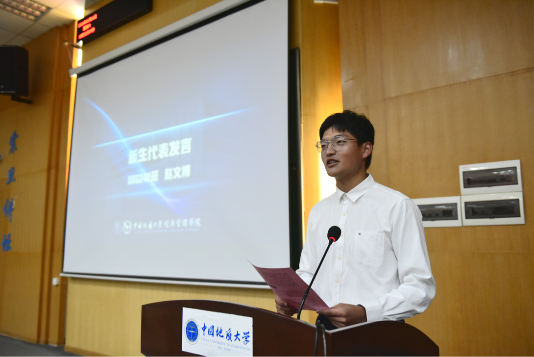 典礼第五项2024级新生代表赵文博同学发言。他以同为地大校友的母亲为榜样。他号召全体新生珍惜宝贵的大学时光,在享受大学生活的同时不忘初心,努力学习,积极参加社会实践,不断磨练个人意志,努力成长为勇担社会责任与历史使命的时代新人。