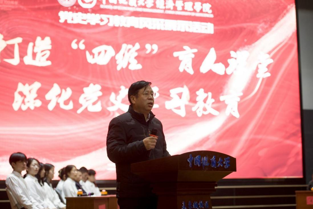 党委开展党史学习教育的阶段性成效和此次“四维”课堂展示活动,并带领在场师生深入学习了党的十九届六中全会精神。他指出,学院党委要切实担负起主体责任,深入推进党史学习教育。一是要深化理论研究阐释,立足学科特色创新建设课程思政和通识课程,将十九届六中全会精神有机融入教育教学,实现思政课程与课程思政深度融合,促进十九届六中全会精神进课堂、进教材、进头脑。二是要深入推进“我为师生办实事”实践活动,打好党史学习教育“收官战”。要推动“办实事”与育人实践有效融合,与社会实践活动、志愿服务活动相结合,培养青年学子专业报国情怀,增强知行合一本领。他勉励广大师生,切实将党史学习教育成效转化为“开新局”的强大动力,营造干事创业的良好氛围,推动学院事业发展再上新台阶。