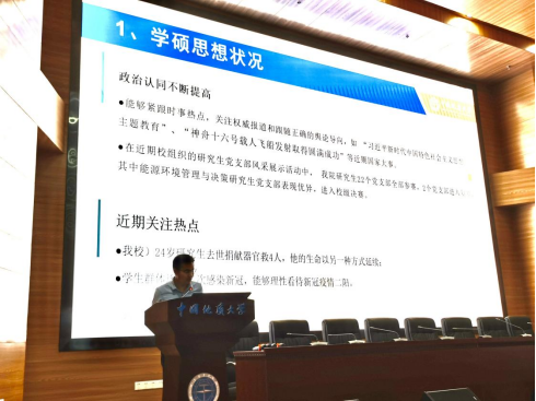 於世为副院长就学术型研究生思想动态、导师指导情况和近期学位论文盲审情况进行了介绍。对学硕学生的政治认同感、师生关系融洽度以及论文撰写修改情况给予了充分肯定。