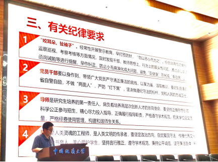 李少杰副书记做了题为《加强师德师风建设共建清廉经管》的主题报告,从近期几起通报违规吃喝的和引发较强社会舆论的典型案例,强调了党员干部要严格按照党中央八项规定要求,严抓作风建设,廉洁自律,遵纪守法,率先垂范。